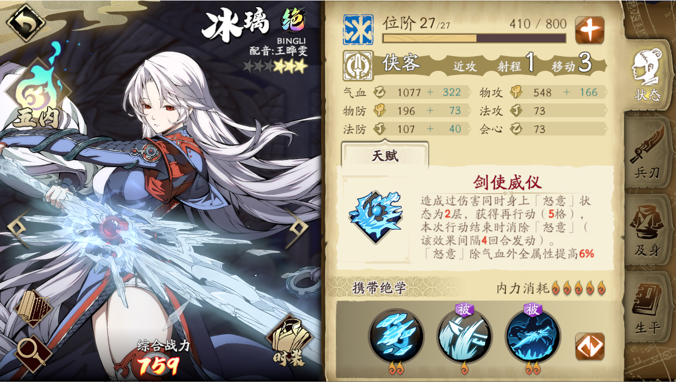 冰璃作為冰系和俠客兩方面的輸出TOP,如果需要冰系輸出無腦練就好了。戰陣搭配的話,最理想的是進和夏侯儀璇璣組隊的[千煌幻日陣],基本任何非屬性本都能使用,三個主角也都很強,可以一直使用。