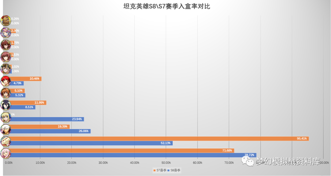 相比先前賽季,S8賽季256強坦克的整體入盒率有所降低,一方面源於坦克位英雄的擴充;另一方面由於英雄越來越多樣化,少坦克或無坦克莽陣打法開始逐漸興起。