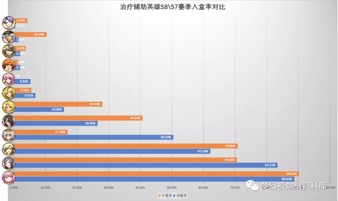受麗可麗絲入盒率大幅提升影響,瑪麗埃爾、愛麗絲等治療位入盒率有所下降;懷特·茜茜最為最新登場的治療英雄,入盒率整體依然偏低。