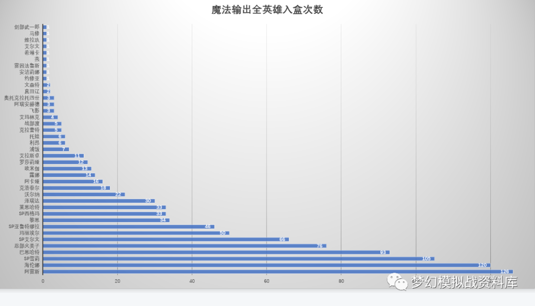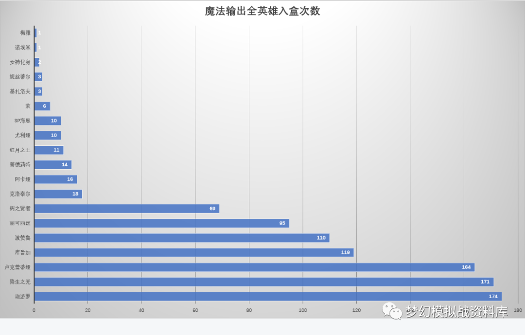 物理輸出英雄雖然在可選英雄方面的數量依然多於魔法輸出英雄,不過在迦遊羅、降生之光、盧克蕾蒂婭的帶動下,魔法輸出英雄的總入盒次數為997次,高於物理輸出英雄全部入盒次數的973次,而頭部輸出位英雄選擇方面,智力型英雄佔據了絕對優勢。