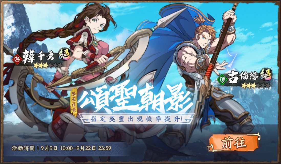 頌聖朝影限定召喚開啟,絕品英靈韓千秀、古倫德召喚機率提升。