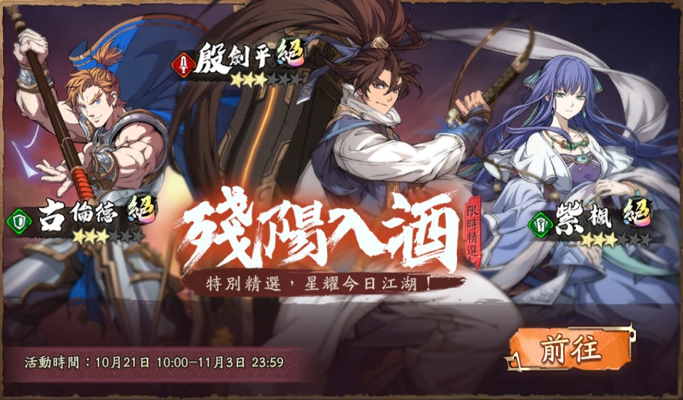➤殘陽入酒限時精選開啟,您從本活動中召喚的首個絕品英靈,必為殷劍平&古倫德&紫楓三名絕品英靈中您尚未獲得的英靈。(英靈絕學介紹可前往遊戲內“資訊”查看)