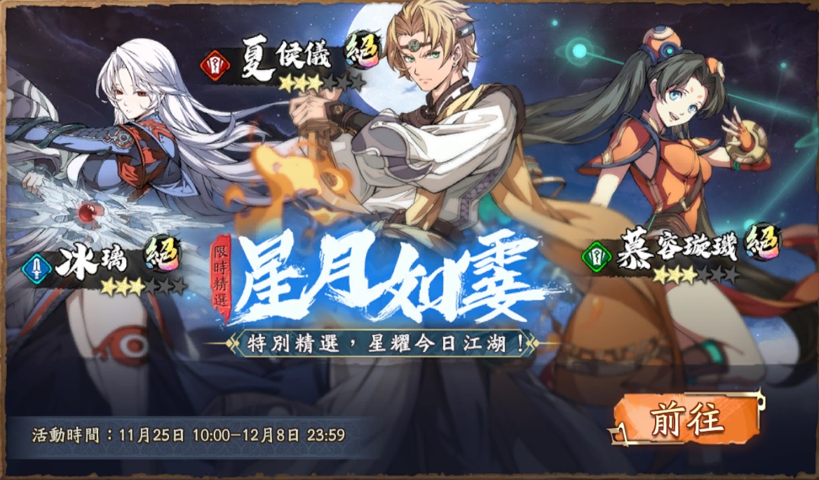 ➤星月如霎限時精選開啟,您從本活動中召喚的首個絕品英靈,必為冰璃&夏候儀&慕容璇璣三名絕品英靈中您尚未獲得的英靈。(英靈絕學介紹可前往遊戲內“資訊”查看)