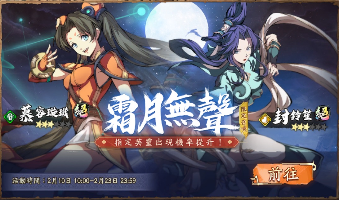 霜月無聲限定召喚開啟,絕品慕容璇璣、封鈴笙召喚機率提升。(更多英靈絕學介紹可前往遊戲內“資訊”查看)