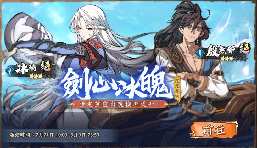 劍心冰魄限定召喚開啟,絕品英靈殷無邪、冰璃召喚機率提升。(更多英靈絕學介紹可前往遊戲內“資訊”查看)