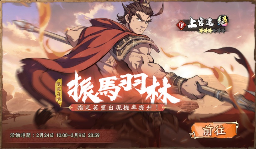 振馬羽林限定召喚開啟,新絕品英靈上官遠召喚機率提升。