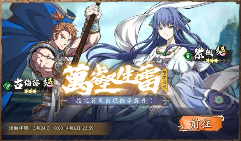 ➤萬壑生雷限定召喚開啟,絕品英靈古倫德、紫楓召喚機率提升。(更多英靈絕學介紹可前往遊戲內“資訊”查看)
